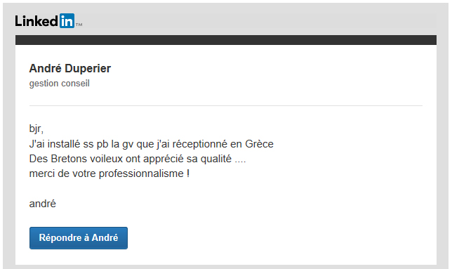 Je vous remercie pour votre efficacité a tous les niveaux. Je ne vais pas manquer de recommander votre société a mes amis marins.